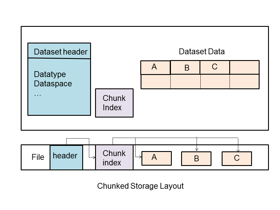 Each chunk is stored as a separate contiguous block in the HDF5 file. There is a chunk index which keeps track of the chunks associated with a dataset: