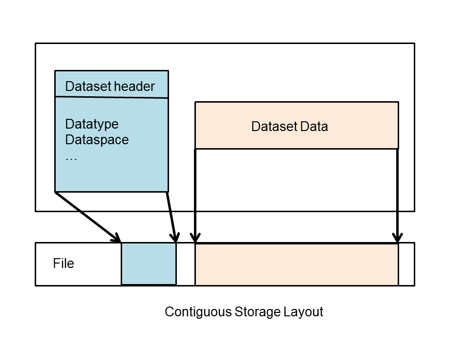 If the storage layout is contiguous, then the raw data values will be stored physically adjacent to each other in the HDF5 file (in one contiguous block). This is the default layout for a dataset. In other words, if you do not explicitly change the storage layout for the dataset, then it will be stored contiguously.