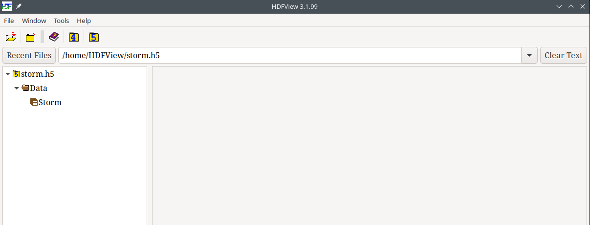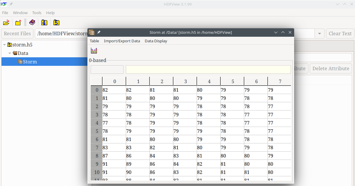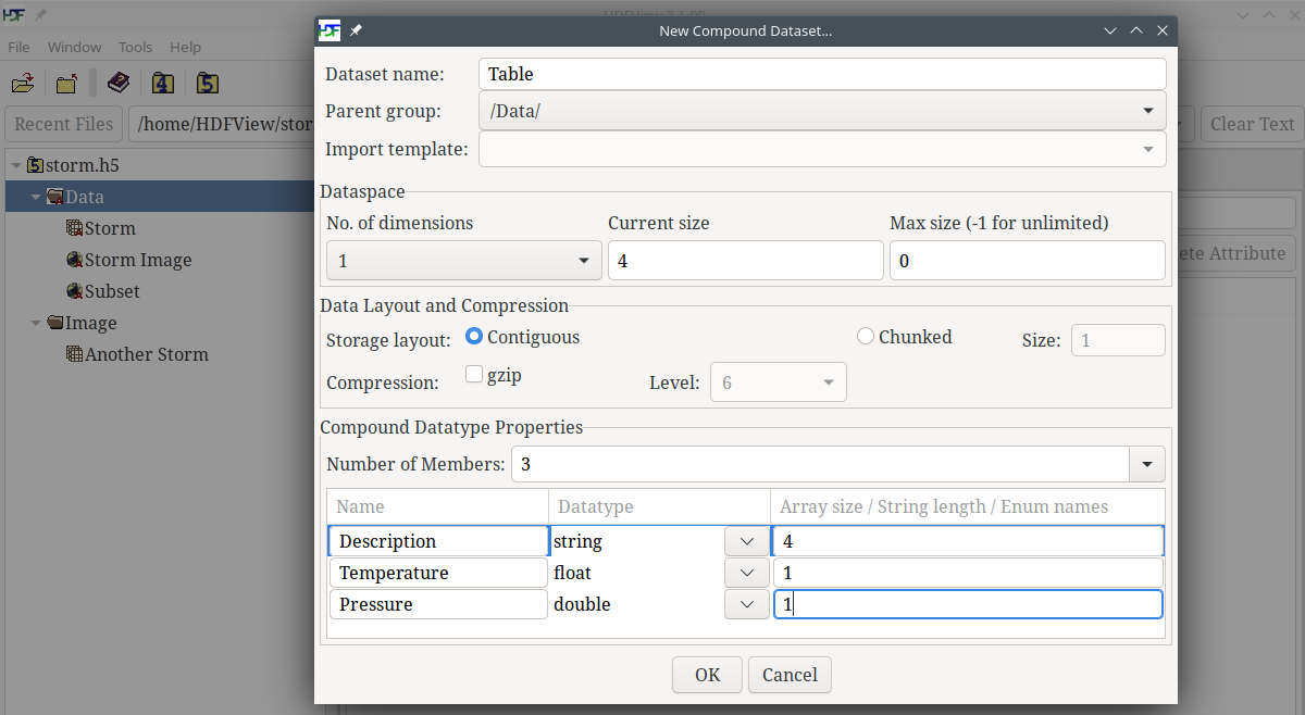 The steps below describe how to create a file (storm.h5), group (/Data), and a contiguous dataset (/Data/Storm) using HDFView. A group is an HDF5 object that allows objects to be collected together. A dataset is an array of data values. A contiguous dataset is one that is stored as a single block in the HDF5 file.